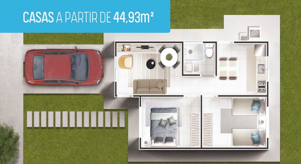 Casas com 2 dormitórios, banheiro, sala, cozinha e área de serviço.